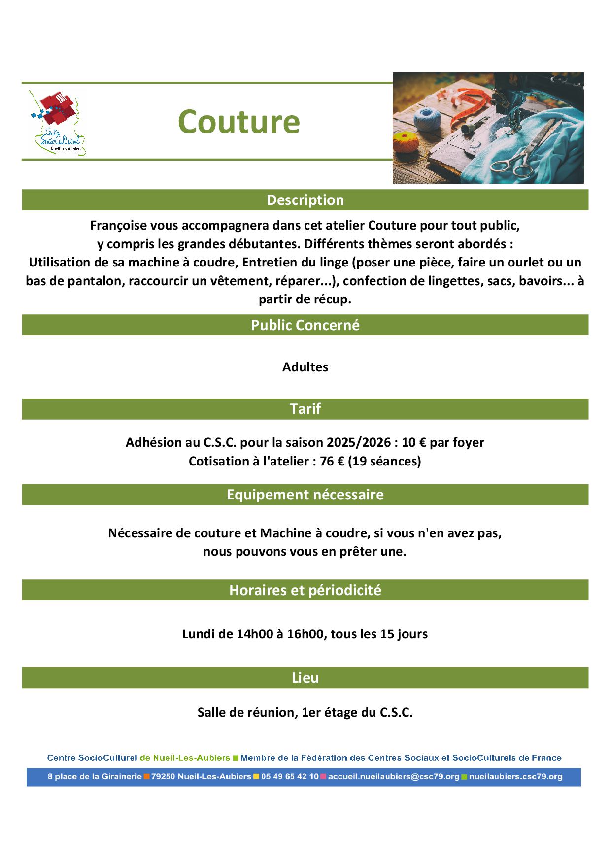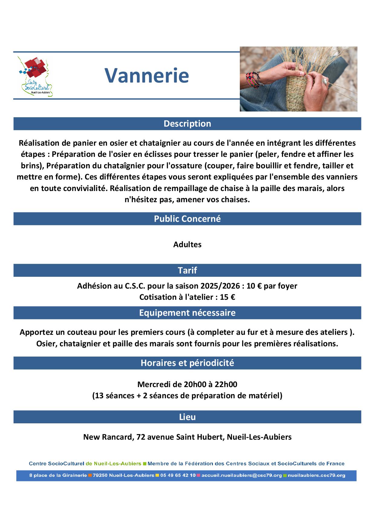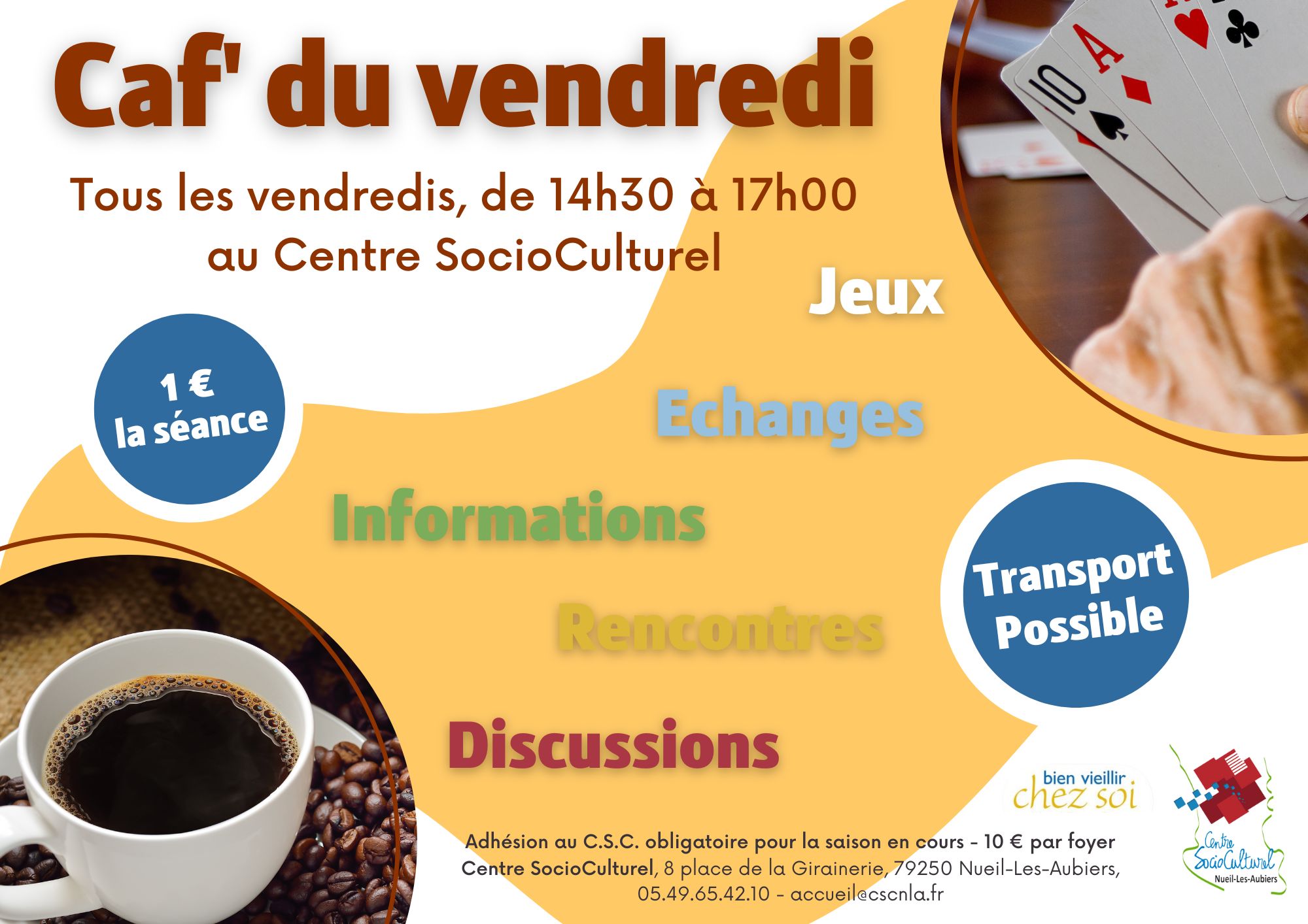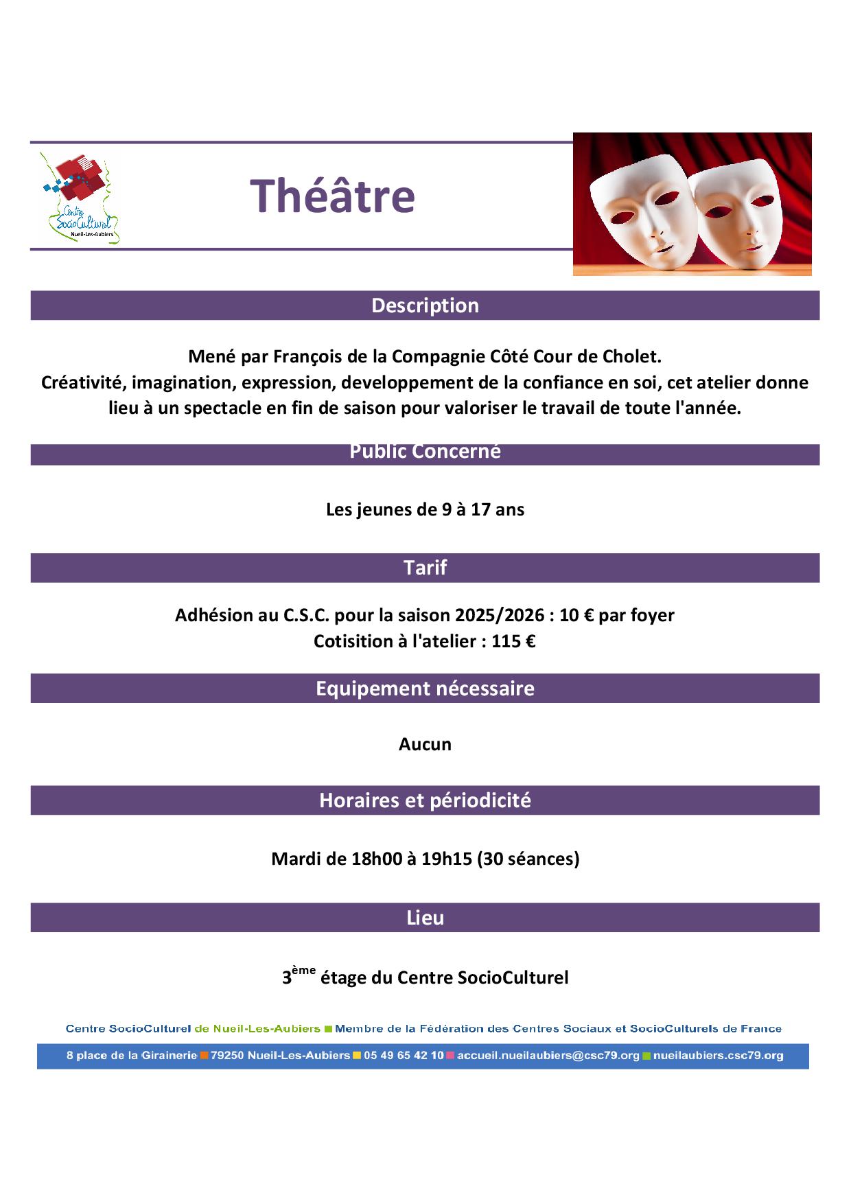 Inscription aurpès de l'accueil du C.S.C. au 05.49.65.42.10 ou accueil@cscnla.fr