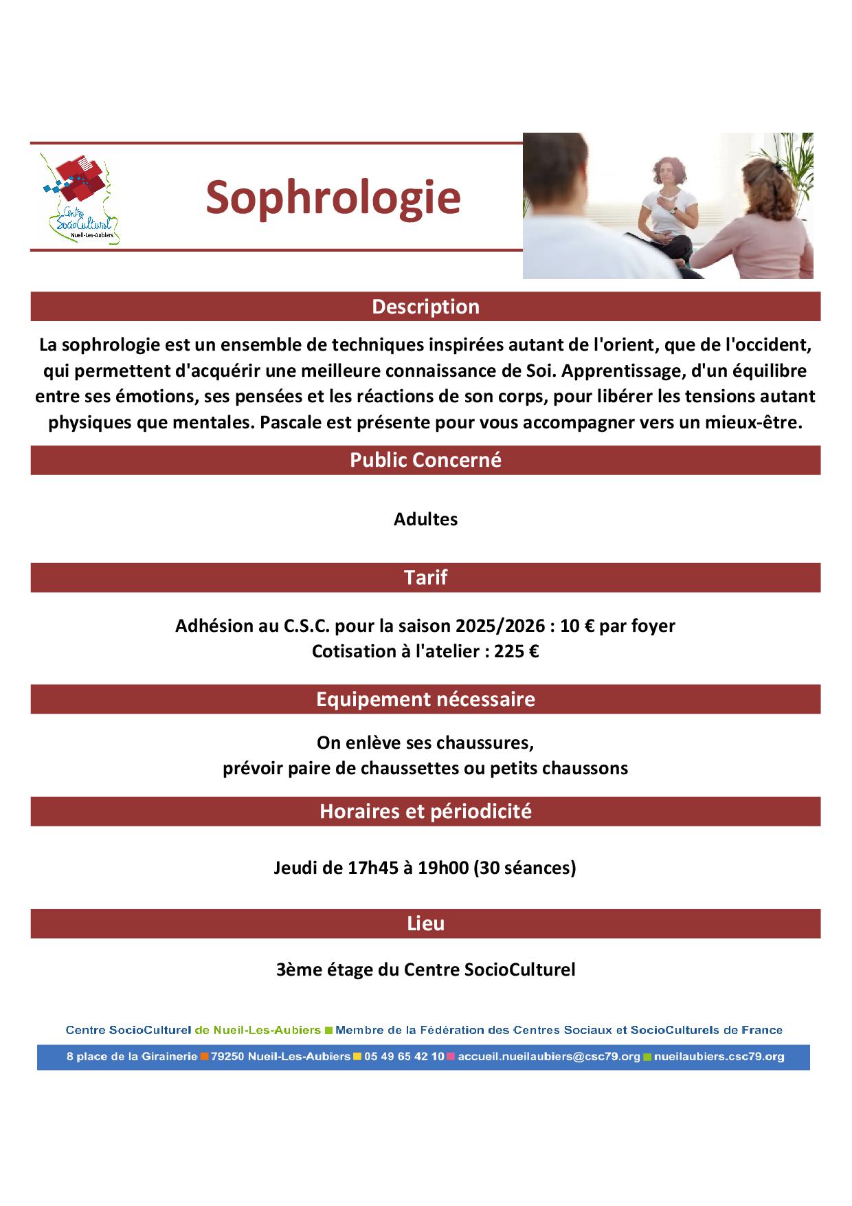 Le lundi de 14h30 à 16h30, une fois par mois au Centre SocioCulturel de Nueil-Les-Aubiers. Tarif : Adhésion au C.S.C. 10 € + 10 € (10 séances). Première séance gratuite et ouverte à tous.