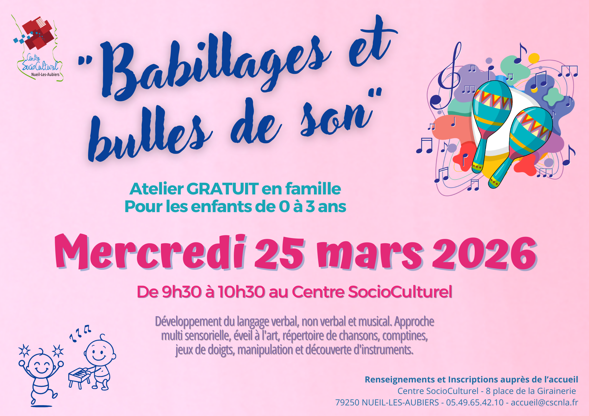 Inscription auprès de l'accueil du C.S.C. au 05.49.65.42.10 ou accueil@cscnla.fr.