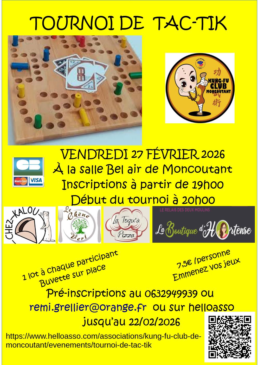 le club de Kung Fu de Moncoutant, organise un tournoi de tac-tik à la salle bel air de Moncoutant. Ouverture 19h, début du tournoi 20h.