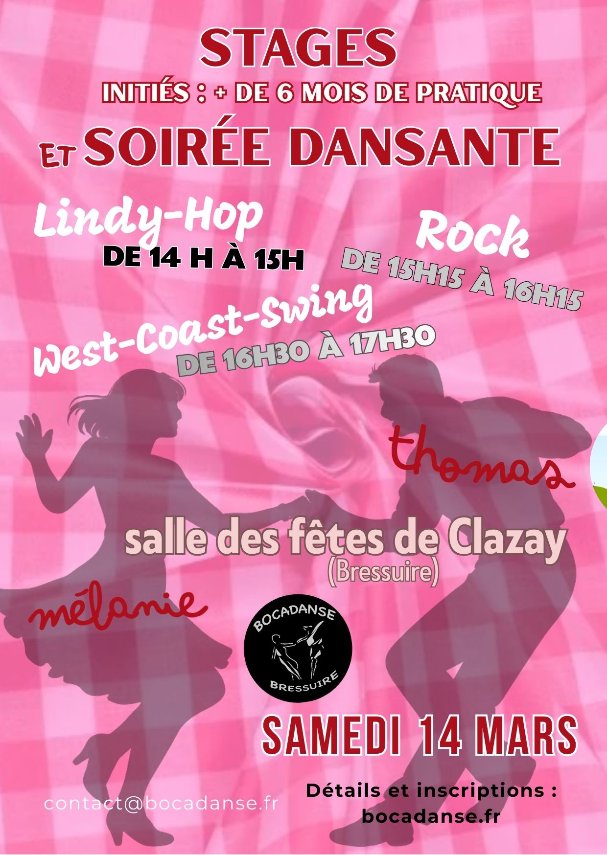 Infos & Inscriptions : 0619653930 contact@bocadanse.fr https://www.bocadanse.fr/ Venez comme vous êtes, repartez avec le sourire et le swing dans les jambes !