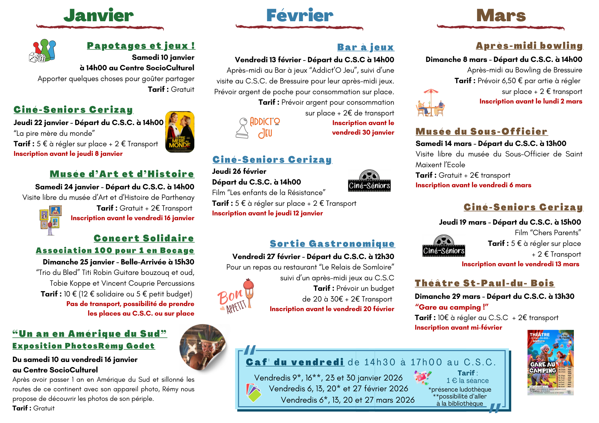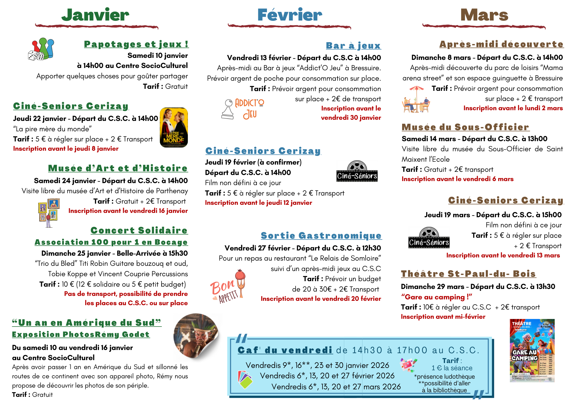 Renseignements à l'accueil du C.S.C. au 05.49.65.42.10 ou accueil@cscnla;fr