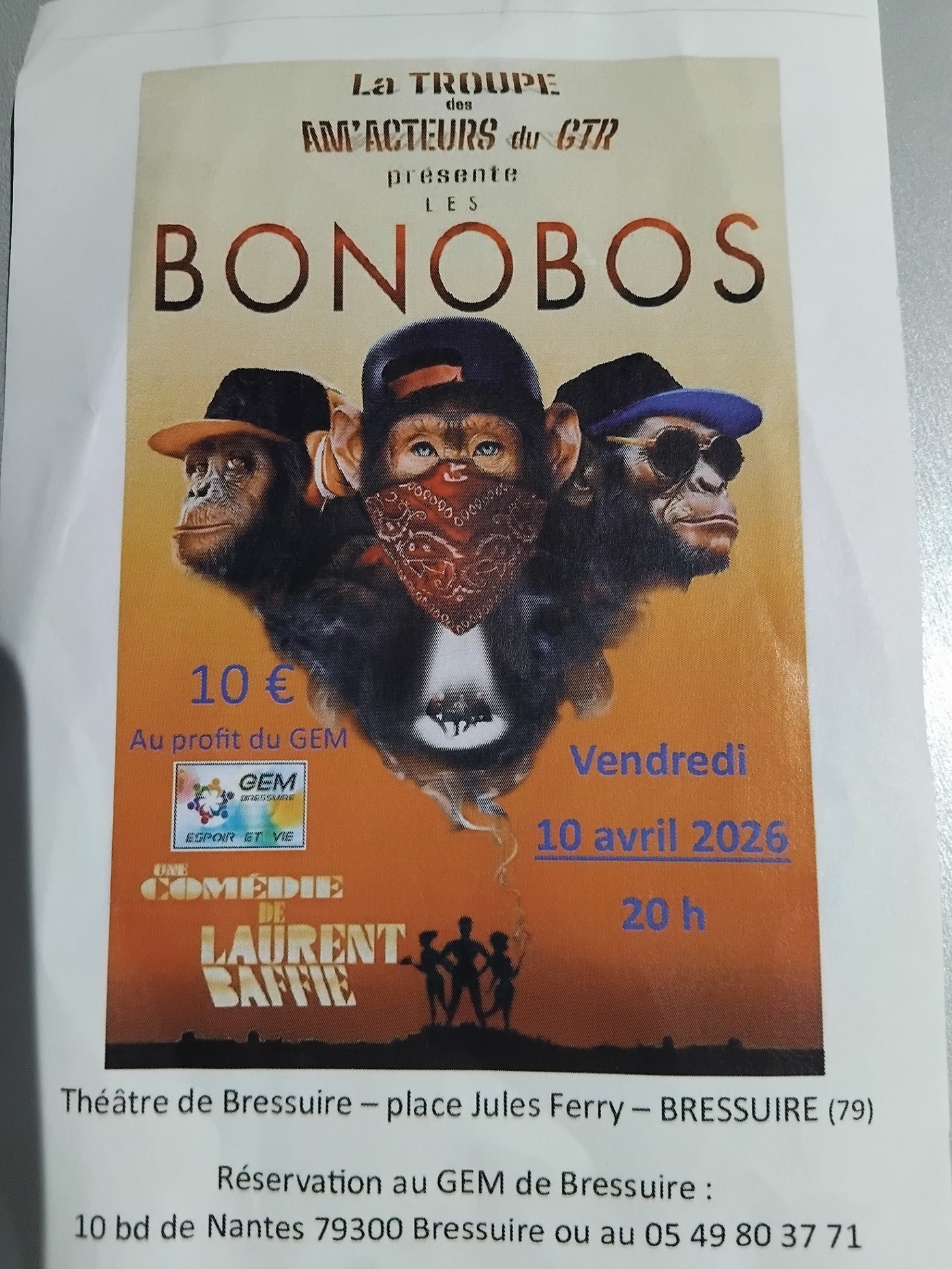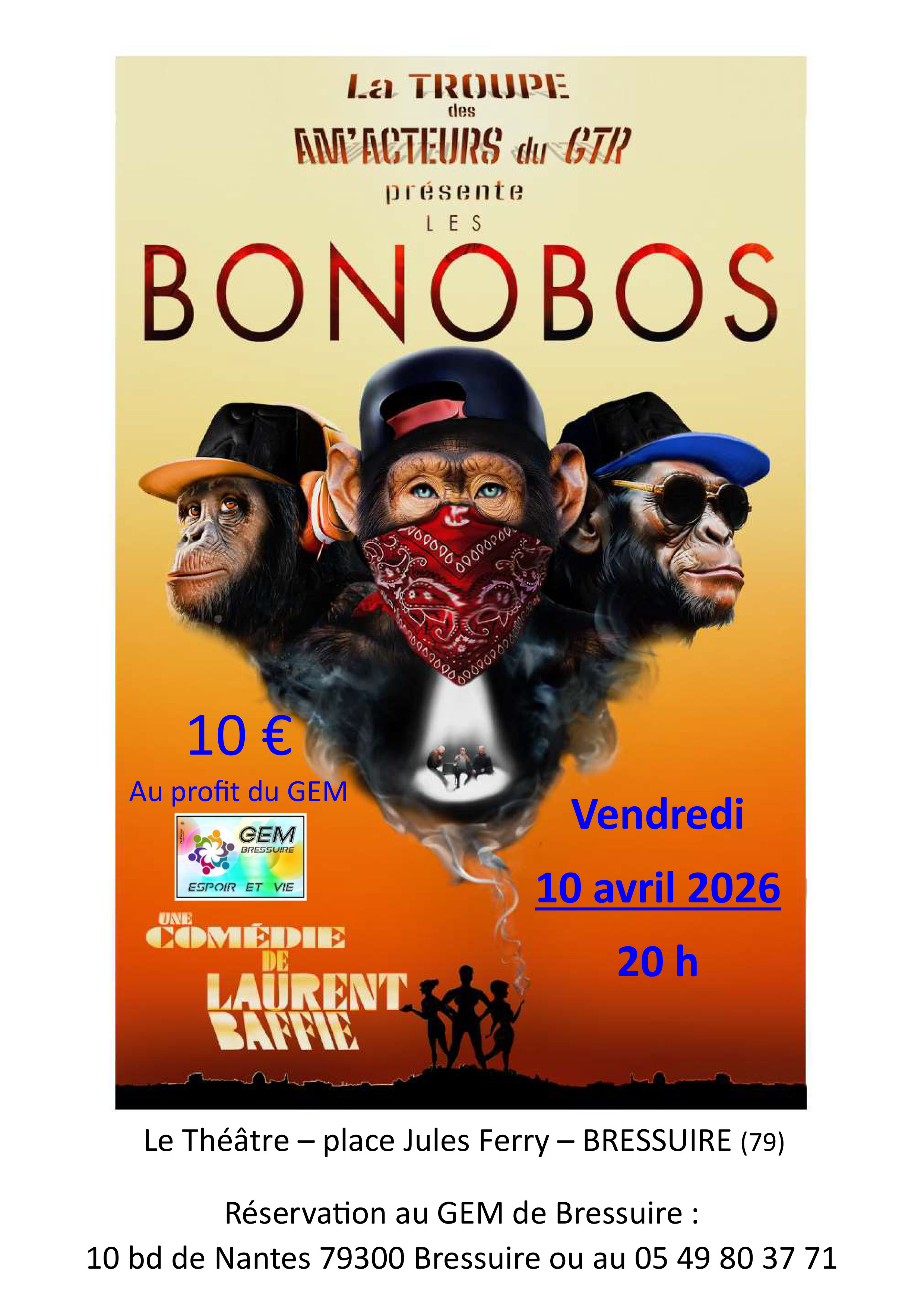 le GEM invite les BONOBOS, une comédie de Laurent BAFFIE au théâtre de Bressuire place Jules Ferry le vendredi 10 avril 2026 à 20h.
